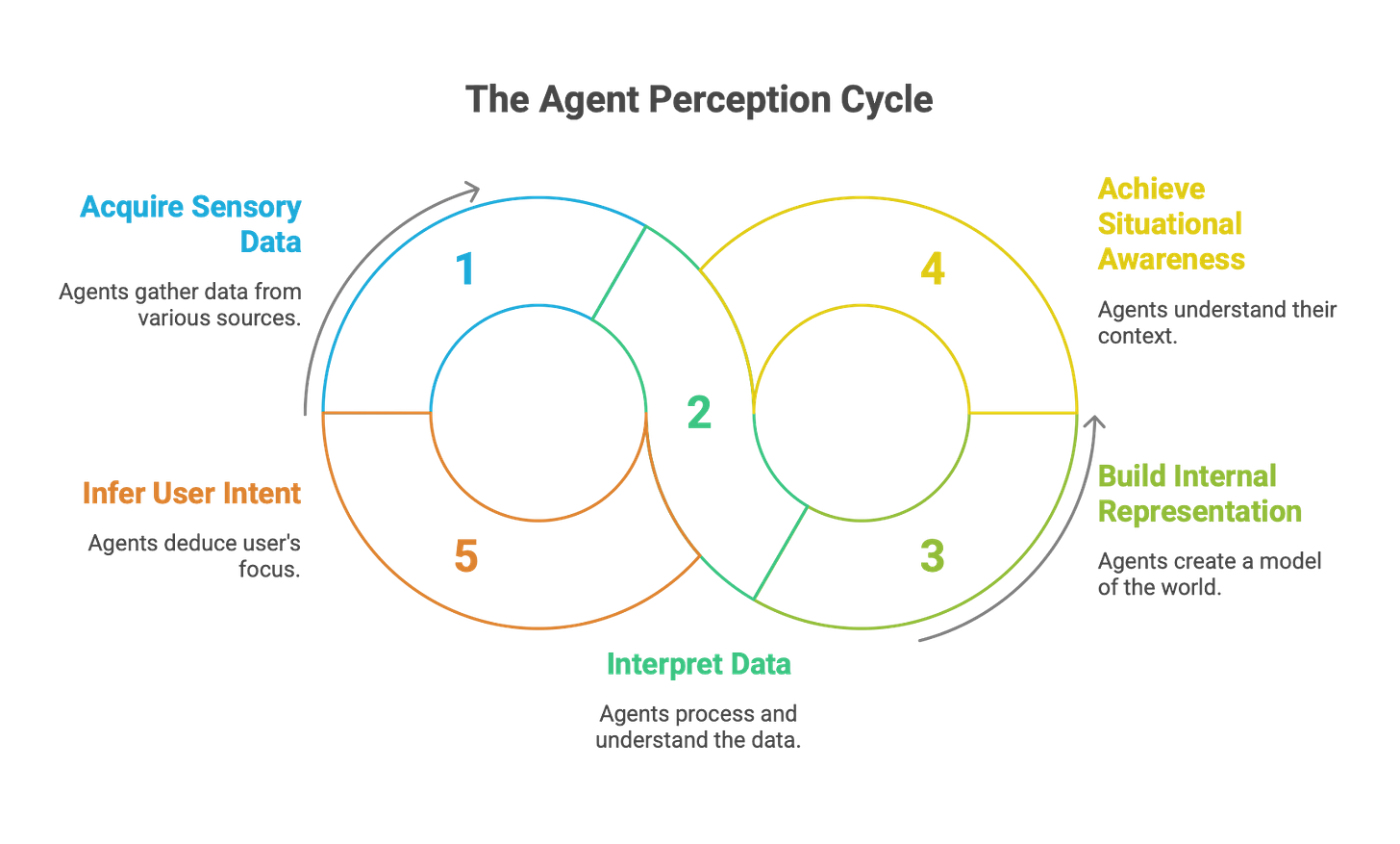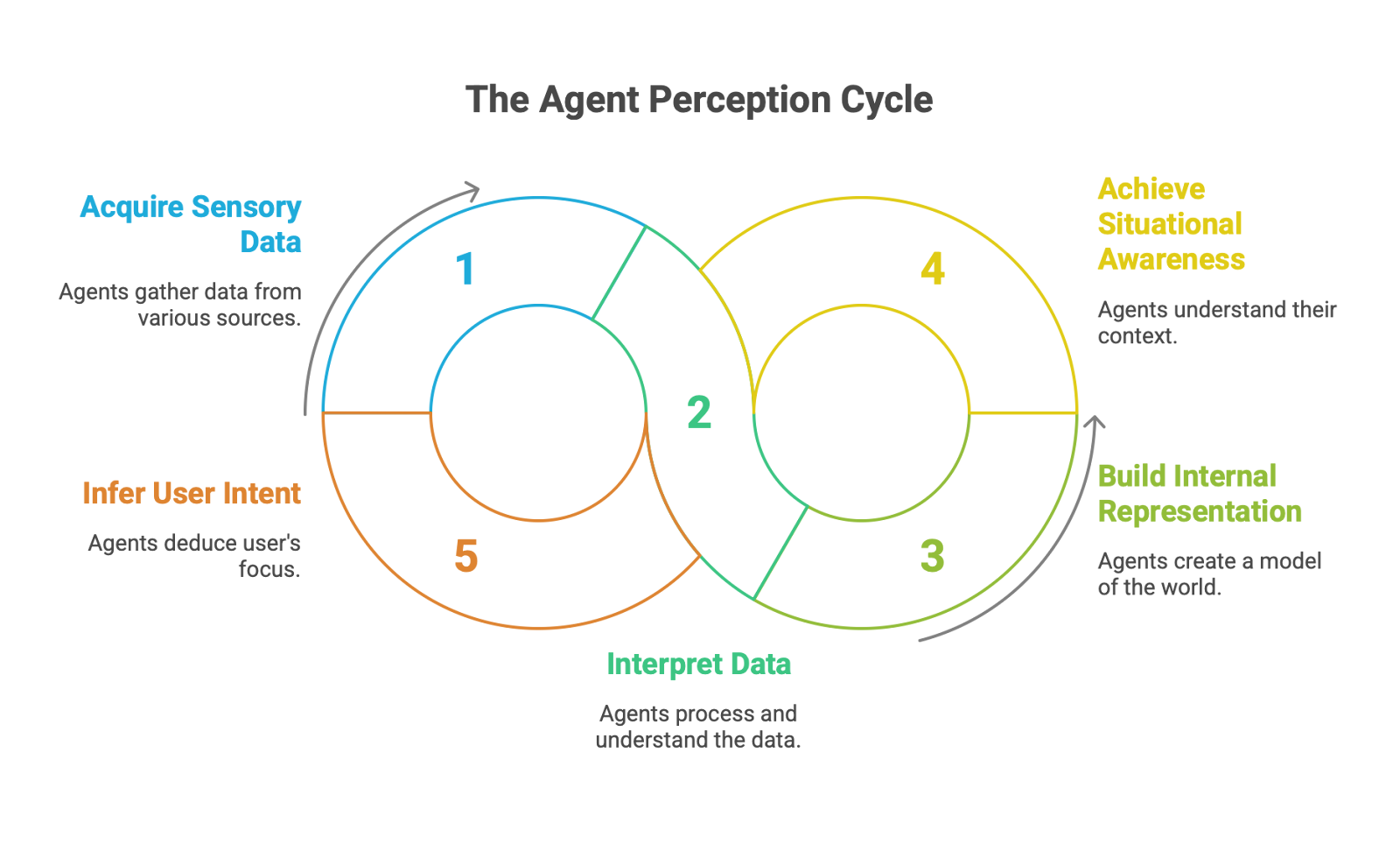 Perception is the process through which an agent acquires and interprets sensory or environmental data to build its internal representation of the world. It is the agent's primary input channel, the bridge between the external environment and its internal state.