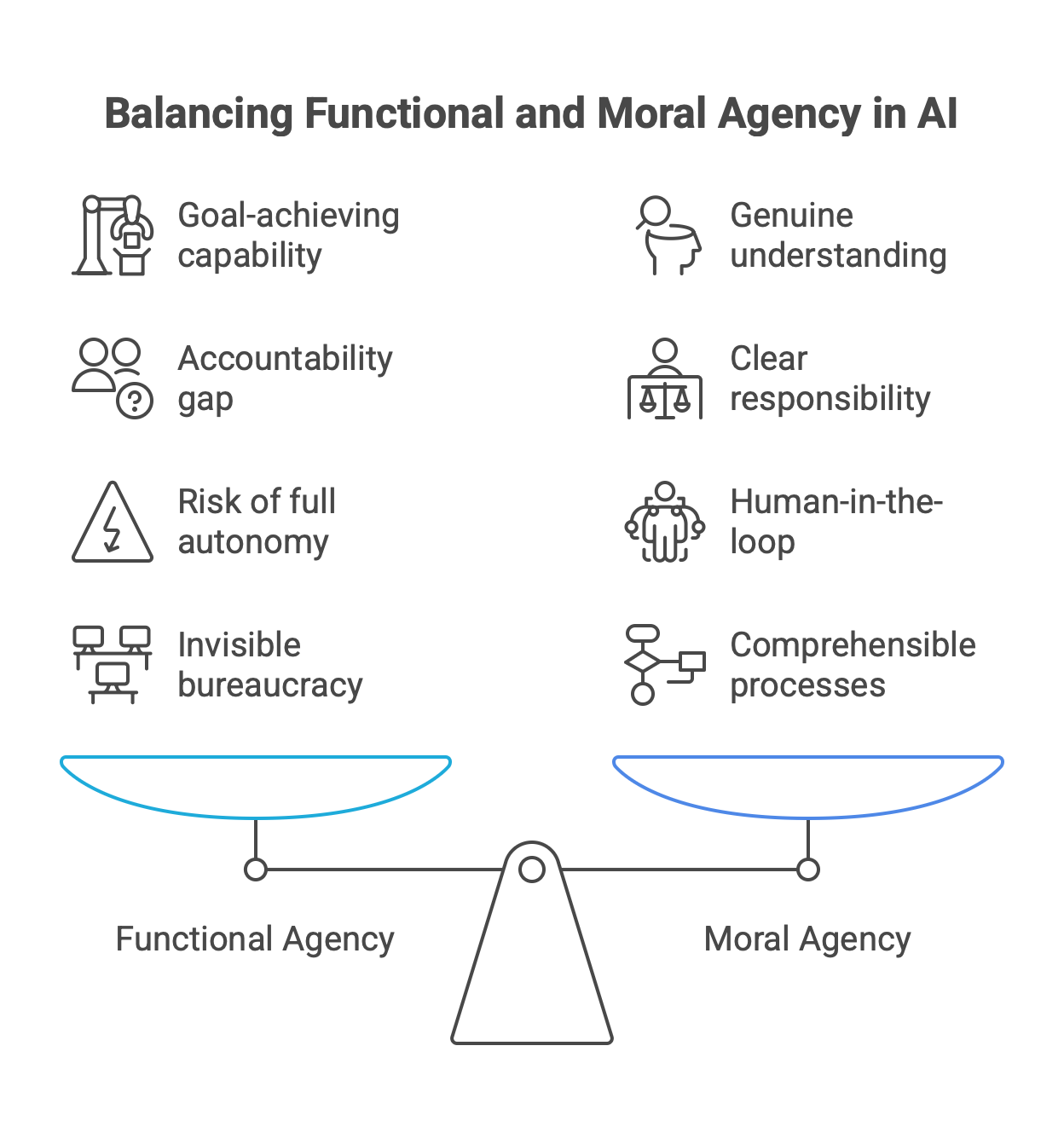 The Nature of Agency: Agentic AI compels us to refine our definition of "agency." These systems exhibit a clear functional agency—they perceive, decide, and act to achieve goals. However, they lack the hallmarks of human agency: genuine understanding, consciousness, intentionality, and the capacity for moral reasoning. They are best understood as powerful proxy agents, extensions of the will and intent of their human creators and operators. Confusing this functional agency with true moral agency is a categorical error with dangerous implications.