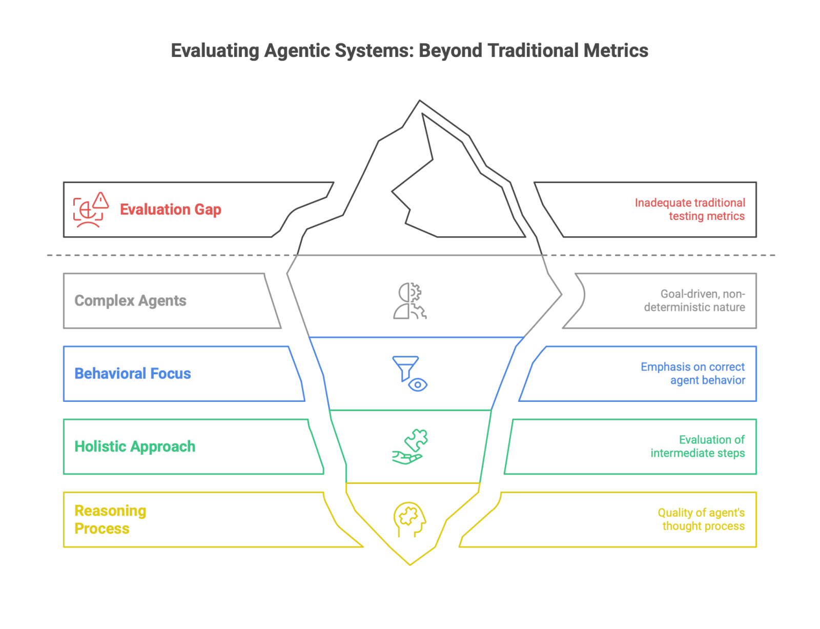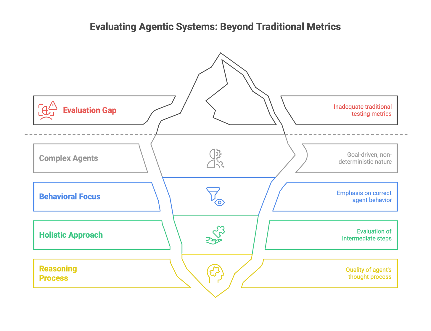 A major challenge in the agentic era is the evaluation gap: traditional software testing metrics (e.g., unit test pass/fail rates) are inadequate for measuring the performance of complex, goal-driven, non-deterministic agents. Success is no longer about whether a function returns the correct value, but whether the agent exhibits the correct behavior to achieve a goal. This requires a more holistic and granular approach to evaluation, one that focuses not just on the final outcome but also on the quality of the intermediate steps and the reasoning process the agent followed to get there.