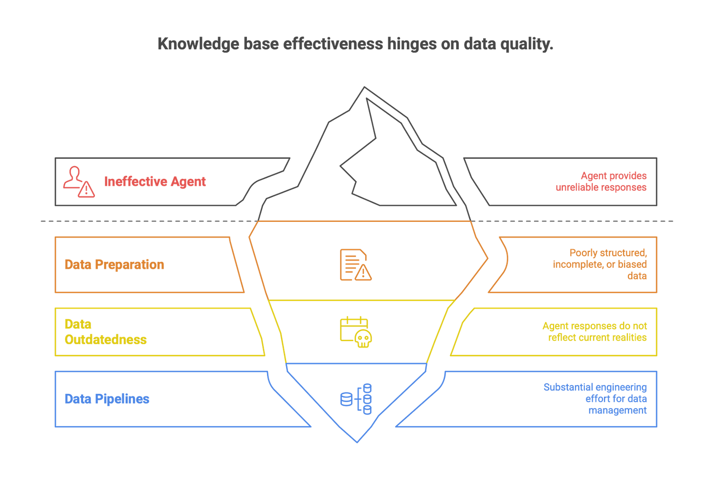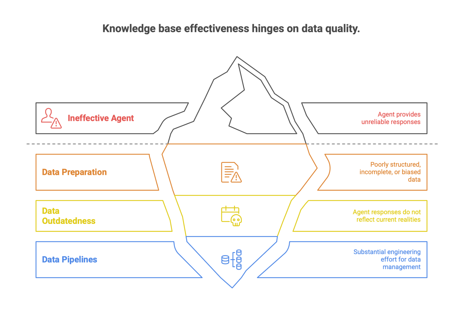Despite its power, the effectiveness of a knowledge base is entirely dependent on the quality of its underlying data. This introduces significant technical challenges for engineering teams. The most critical pitfall is insufficient data preparation. A knowledge base populated with poorly structured, incomplete, inconsistent, or biased data will inevitably lead to an ineffective and unreliable agent. Similarly, if the data is outdated, the agent's responses will be outdated, a critical failure for systems that must reflect current realities. Building the necessary data pipelines for collection, cleaning, document preparation, and preprocessing is a substantial engineering effort.